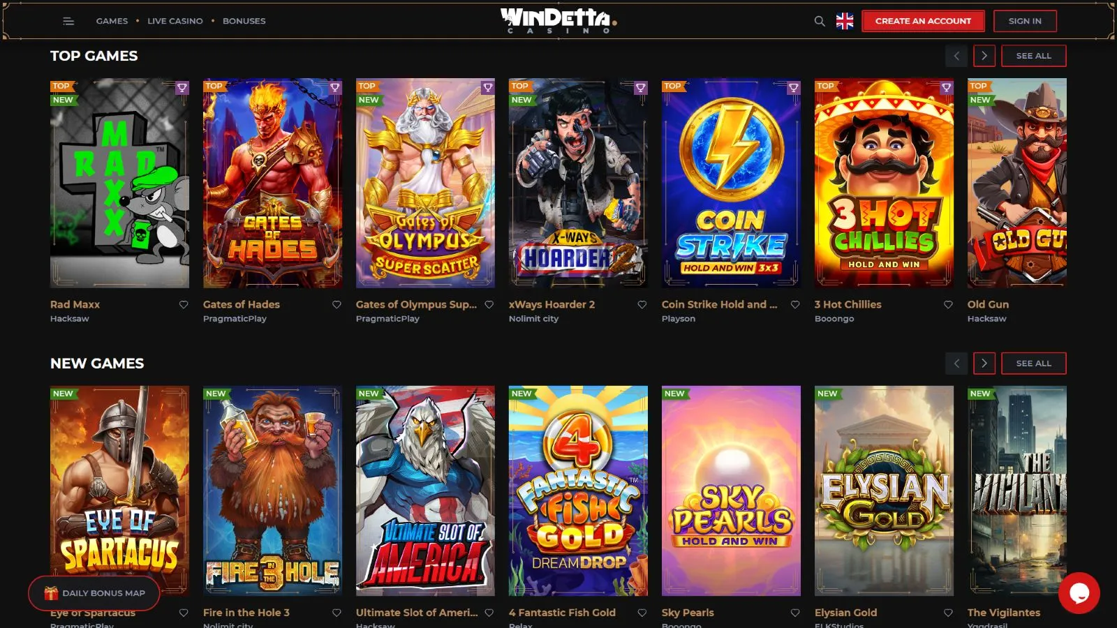 The home page of Windetta casino is a visual treat with an array of vibrant and engaging elements. Stunning promotions take center stage on a prominent slider, enticing you with the latest offers. Below, popular games are neatly arrayed, showcasing player favorites. Tournaments are highlighted, offering thrilling competition and prizes. New games are showcased separately, inviting you to explore the latest additions to the casino’s repertoire.