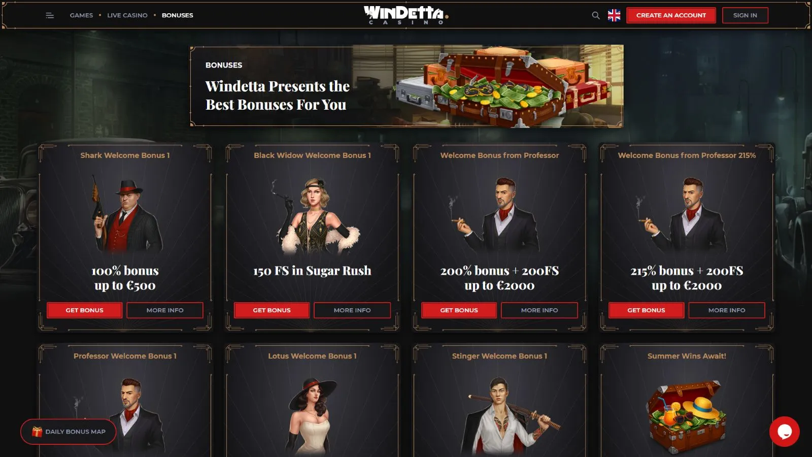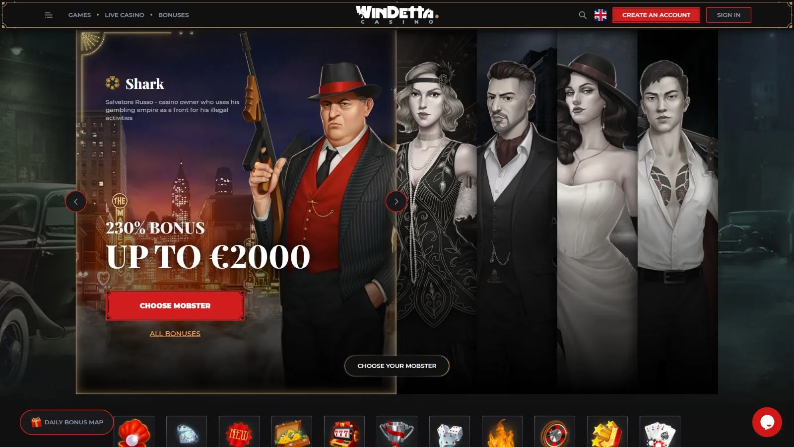If you’re seeking thrilling gaming action, coupled with an array of generous bonuses and promotions, Windetta casino is your destination! The casino has designed an intriguing bonus structure that encompasses various welcome bonus packages, catering to the needs of diverse players. As per your chosen mobster, you can indulge in one of the five distinct welcome bonuses, each tailored to enhance your gaming experience and boost your winning opportunities. Regrettably, the casino does not provide a registration bonus at this time, but the extensive selection of welcome packages more than compensates for it.