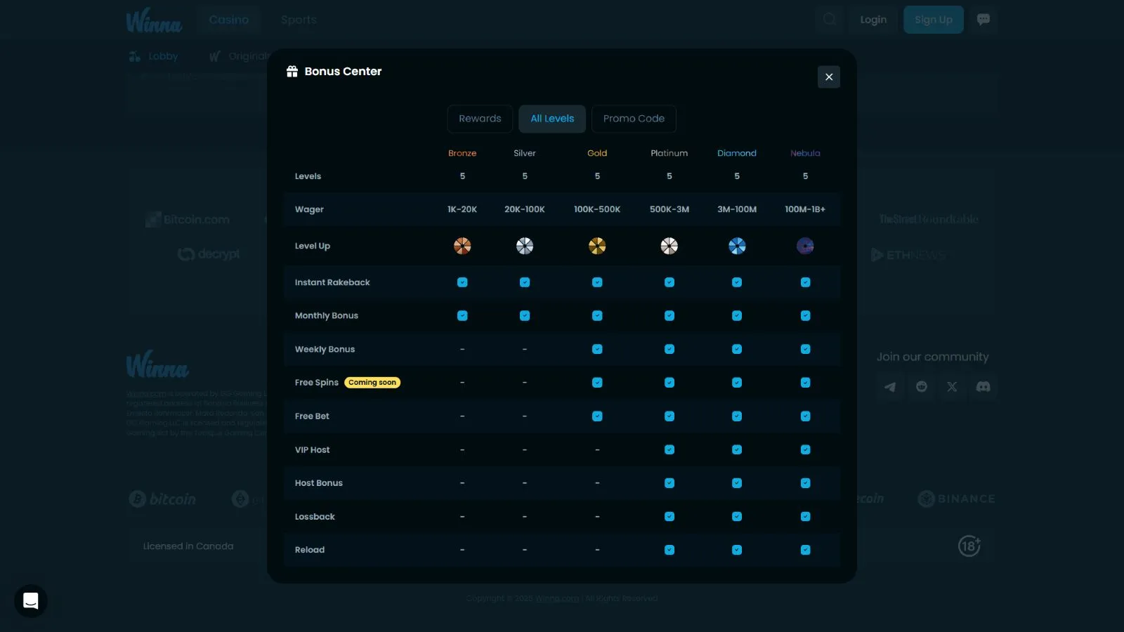 Winna Casino offers VIP perks such as weekly balance boosts and monthly bonuses to enhance players' gaming experience. Additionally, you get instant rakebacks that provide access to extra funds while playing. You also get bi-weekly free bets calculated based on your total wager, and usable in the sportsbook.