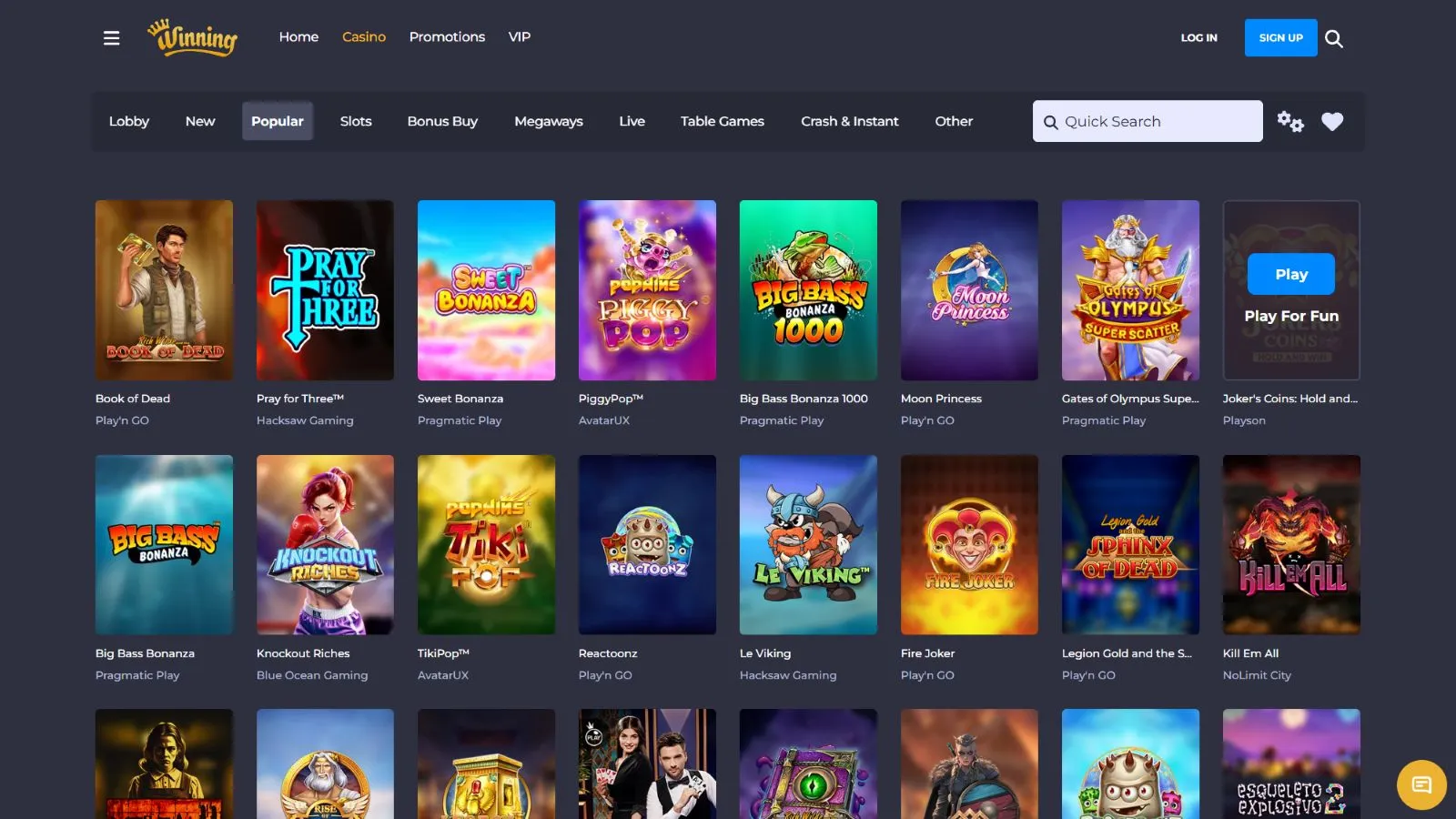 We are confident that you will be amazed by Winning.io’s offer of casino games. To find them, you can either click on the “Visit Casino” button on the homepage or click on the burger menu and select “Casino”, before you choose your desired category from the drop-down menu. On the casino page, you will see a big slider with a few promotions, and below the slider, you will notice a bar for choosing a game category.