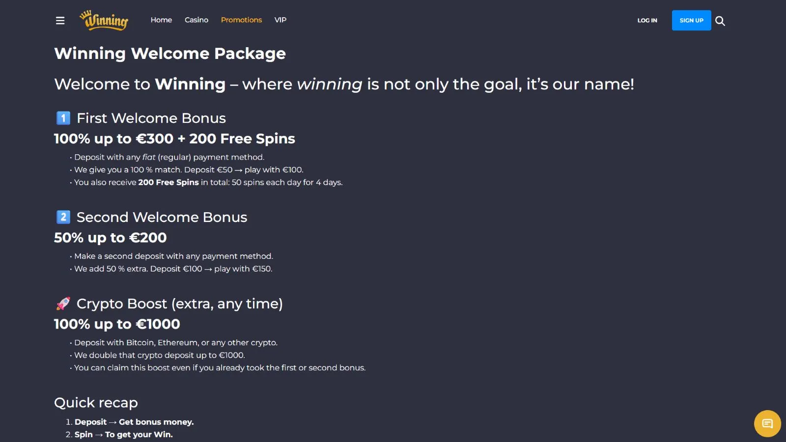 At Winning.io crypto casino you can choose one of the two welcome deposit bonuses: casino and sportsbook.
