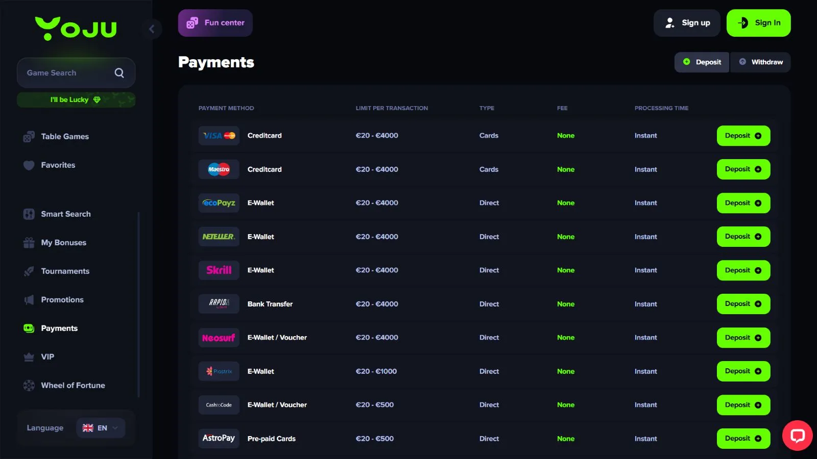 At YOJU Casino, you can fund account balance using: