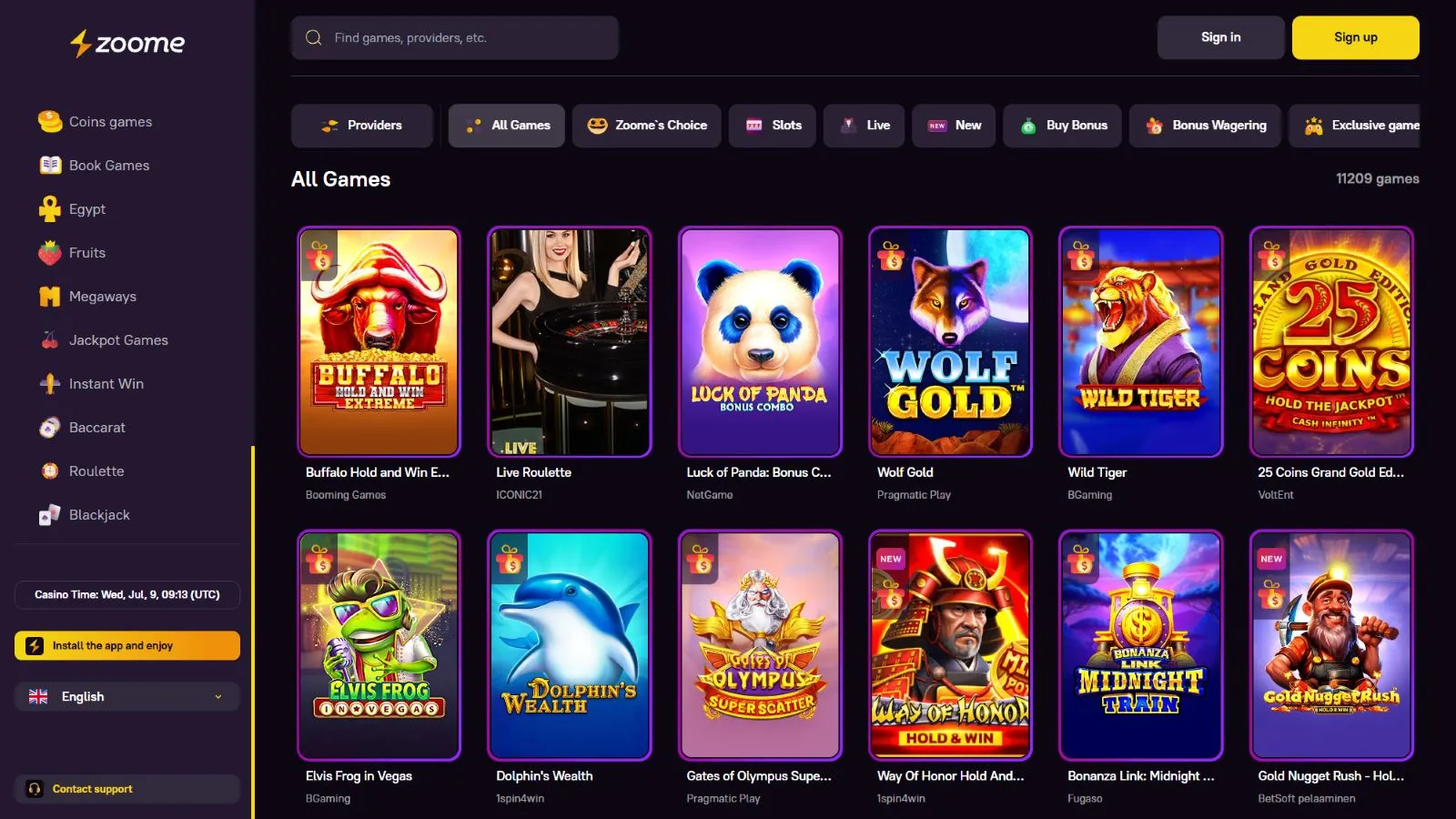 The website of Zoome casino is really an eye-catchy one. In the top menu, you can use the search field, access your profile, make a deposit, check the notifications and see the casino tournaments. From the left menu, you can see your favorite games, last games, slots, table games, Live Blackjack, Game Shows, VIP program, Promotions, Lottery, Tournaments, and Providers. Also, you can change the casino language from English to German, Finnish, French, Norwegian, and Thai.