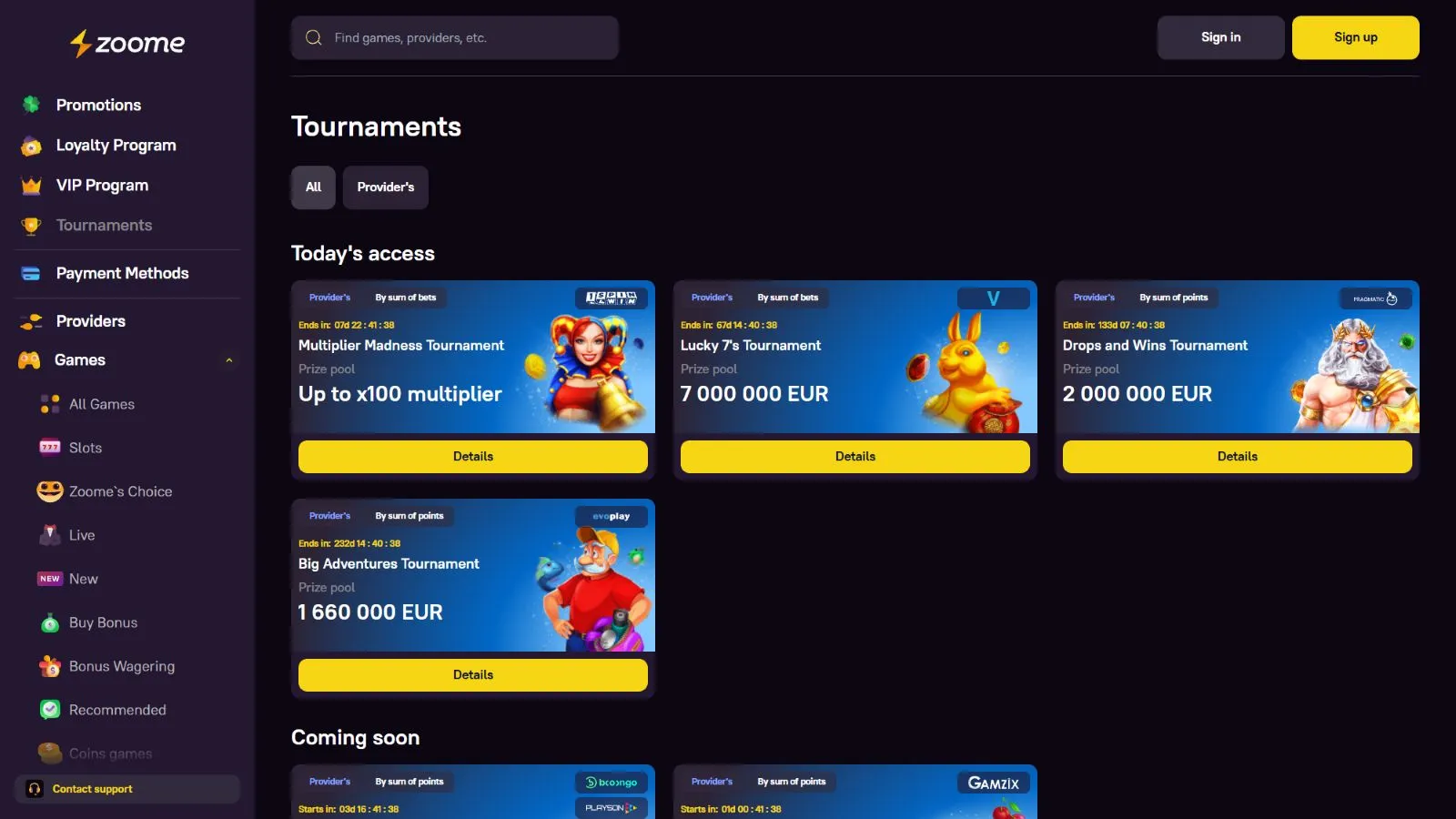 Zoome is an online casino brand on which you would be able to play thousands of casino games. This casino is fully licensed, and you can make deposits using many popular fiat and crypto payment methods. On top of that, you will be able to participate in various lotteries and casino tournaments from which you can make additional gains.