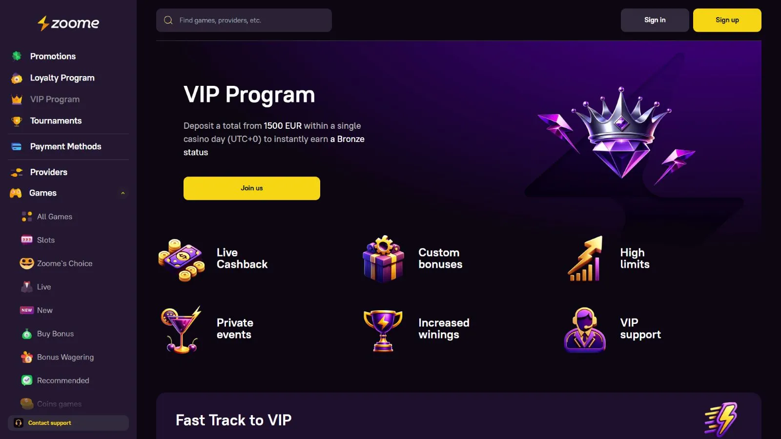 All players at Zoome casino can get additional benefits as they play more. This is the way how Zoome expresses gratitude toward its loyal players. There are 6 levels that you can reach in this VIP program.