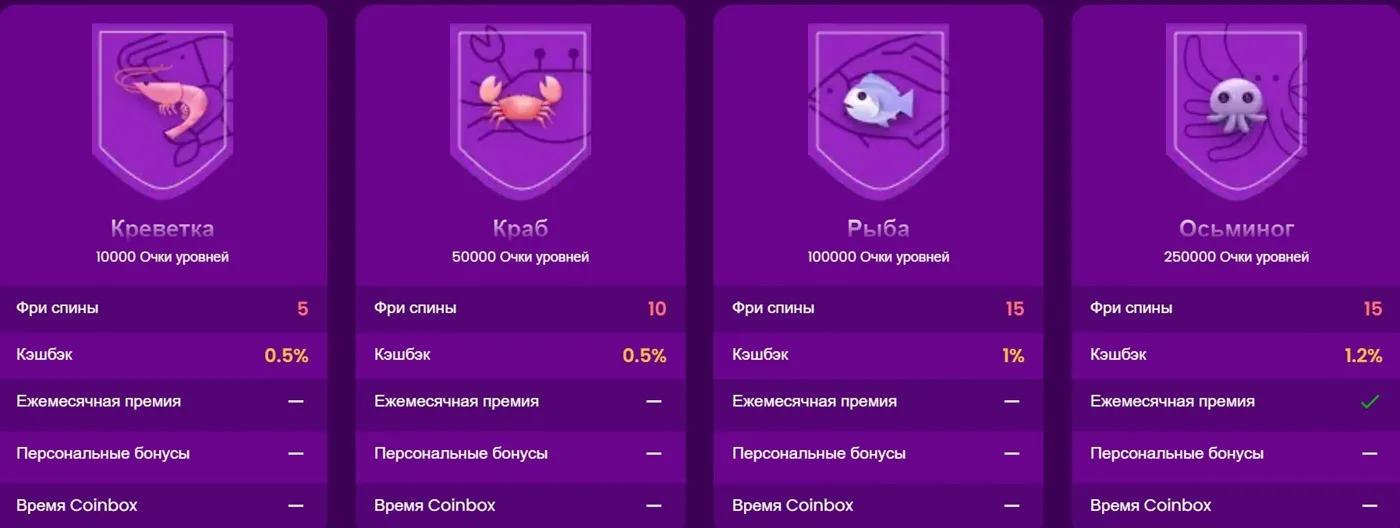| Ежемесячная премия | Получайте бесплатные койны каждый месяц! Чем выше уровень, тем больше ежемесячный бонус. | Осьминог |