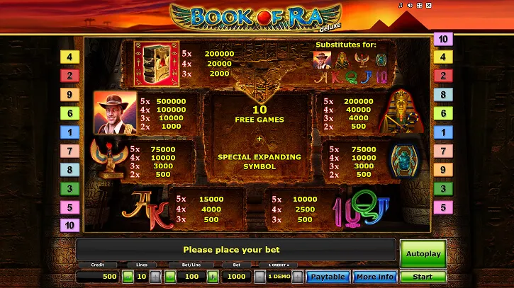 Book of Ra Deluxe offers 5 reels, 3 rows, and 10 paylines which can be adjusted. You can decide to activate just 1 payline or play on all available ones for maximum winning chances. A winning combination is formed when 2 or more matching symbols land on an active payline, from left to right.