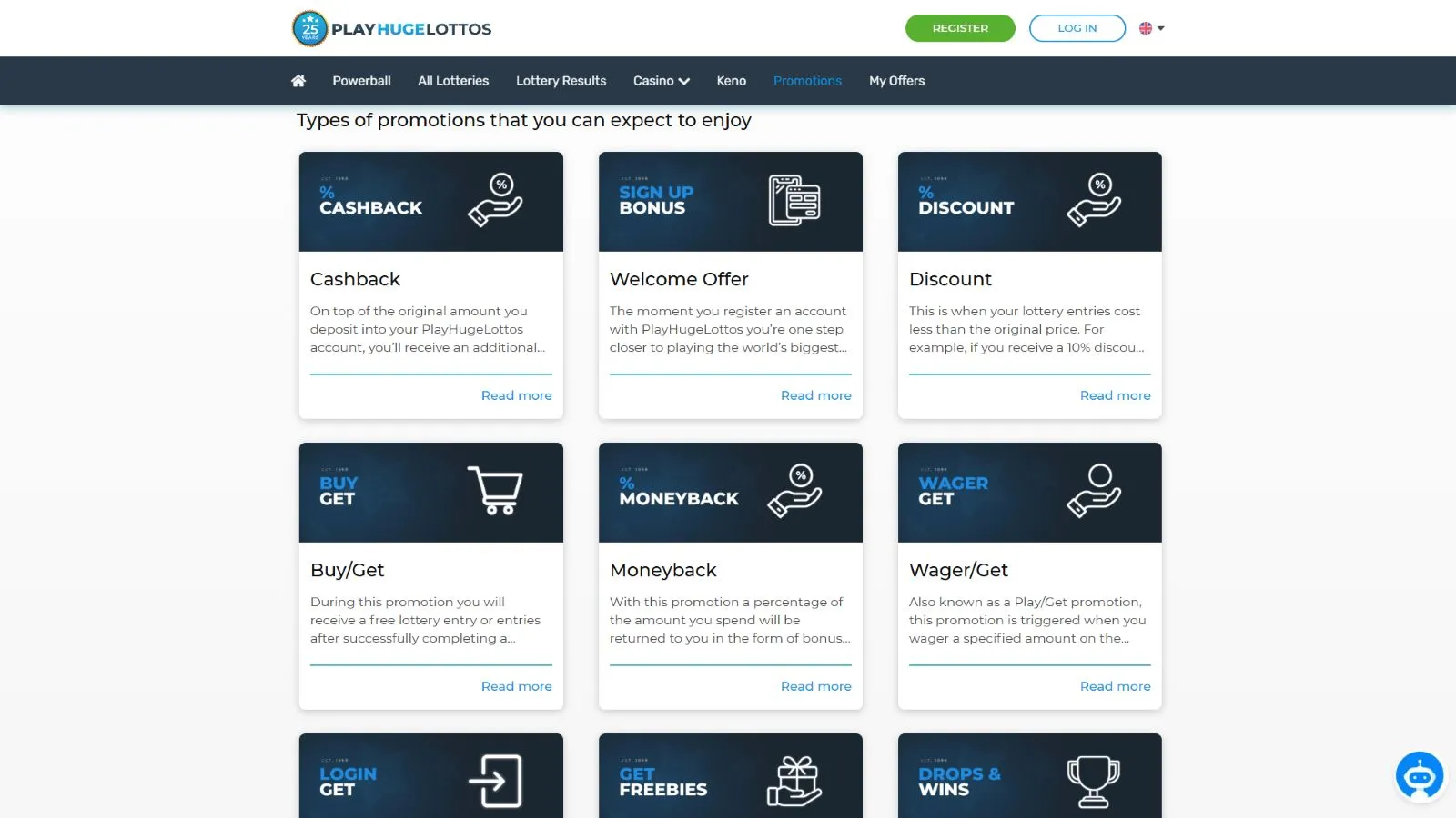 Час від часу Play Huge Lottos дозволяє зекономити на участі в лотереях на криптовалюту за допомогою спеціальних пропозицій. Серед таких пропозицій є набір з п’яти лотерейних квитків на найбільші лотереї. Купивши такий набір в один клік, гравець отримує знижку до 22%. Сайт публікує сповіщення про ексклюзивні промо-акції в Twitter та Facebook.